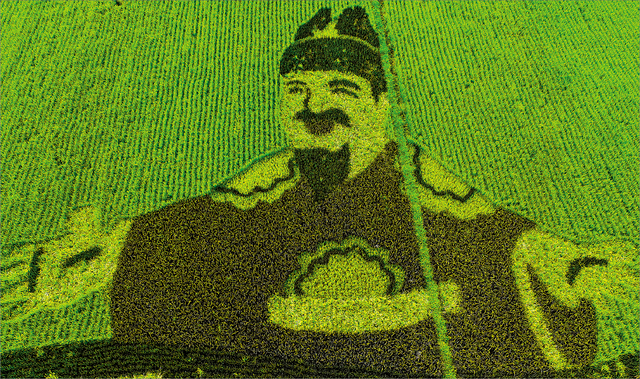 ‘쌀의 날’을 하루 앞둔 17일, 경기 여주의 한 논에 미소 띤 채 들판을 품은 듯한 대왕님의 모습이 눈길을 끈다. 쌀의 날은 ‘米(쌀 미)’자가 ‘八(팔)’ ‘十(십)’ ‘八(팔)’로 풀이된다는 데 착안해 8월18일로 정해 기념하고 있다. 논 그림은 여주시가 유색벼를 활용해 연출했다. 곧 수확기를 맞는 농민들 입가에도 이같은 미소가 가득하길 바라는 마음은 농업계 모두가 하나일 터. ▶관련기사 2면 연합뉴스