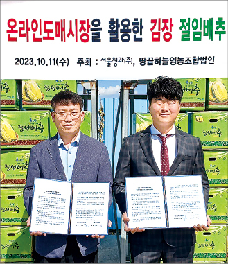 서울청과는 11일 전남 해남 땅끝하늘영농조합법인과 온라인도매시장을 활용한 절임배추 거래 협약식을 개최했다. 이번 협약식을 통해 서울청과와 땅끝하늘영농조합법인은 11월말 개장 예정인 온라인도매시장에서 500t의 절임배추를 거래할 계획이다.