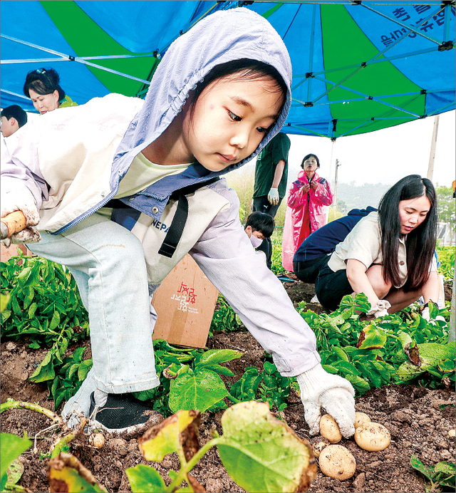 8일 NH농협은행이 전남 나주 이슬촌마을에서 개최한 농촌체험여행 ‘팜캉스’ 행사에 참석한 한 어린이가 감자를 캐고 있다. 팜캉스는 농장을 뜻하는 ‘팜(farm)’과 휴가를 의미하는 ‘바캉스(vacance)’의 합성어이다. 경기 부천과 전남 목포 등지에서 온 어린이들은 유기농 감자 캐기, 된장 만들기 등을 하며 농촌의 진정한 매력을 체감했다. 농협은행은 매달 1회씩 12월까지 가족 단위 도시민 400여명을 대상으로 농작물 수확활동과 지역 맞춤형 체험 프로그램을 진행한다. 나주=이종수 기자